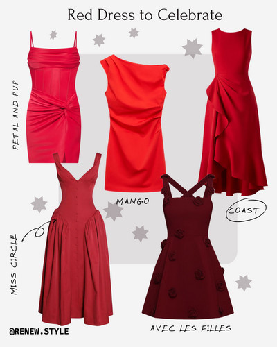 Designs from Petal and Pup, Mango, Miss Circle, Avec Les Filles, and Coast show how versatile red can be — from sleek cocktail silhouettes to romantic, movement-filled shapes. Pair a red dress with minimal accessories and let the color do the work, or lean into evening glamour with metallic heels and statement earrings.