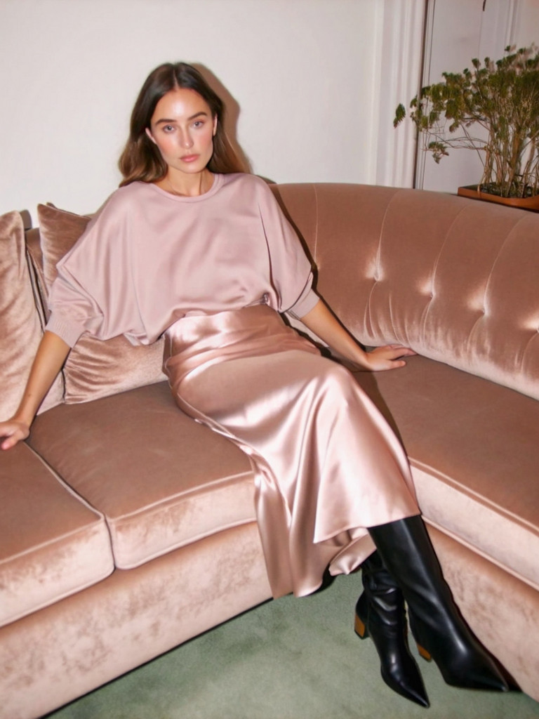Sweater + satin midi skirt + tall boots
